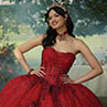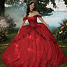 Impresionante vestido de quinceañera con corpiño tipo corsé y escote corazón, y delicados detalles de tul drapeado que dan paso a las mangas con hombros descubiertos. Cristales brillantes brillan sobre lentejuelas con un estampado brillante, con bordados sobre tul brillante con estampado floral abstracto. La falda con ribete de crin le aporta texturas.